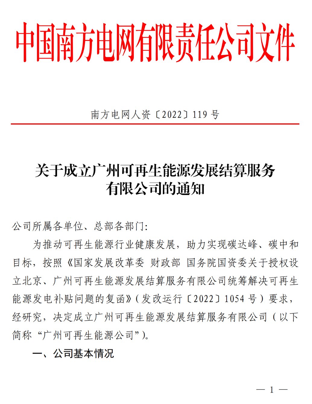 8月11日,中國(guó)南方電網(wǎng)有限責(zé)任公司發(fā)布《關(guān)于成立廣州可再生能源發(fā)展結(jié)算服務(wù)有限公司的通知》,為助力實(shí)現(xiàn)碳達(dá)峰、碳中和目標(biāo),按照《國(guó)家發(fā)展改革委 財(cái)政部 國(guó)務(wù)院國(guó)資委關(guān)于授權(quán)設(shè)立北京、廣州可再生能源發(fā)展結(jié)算服務(wù)有限公司統(tǒng)籌解決可再生能源發(fā)電補(bǔ)貼問(wèn)題的復(fù)函》要求,研究成立廣州可再生能源發(fā)展結(jié)算服務(wù)有限公司。