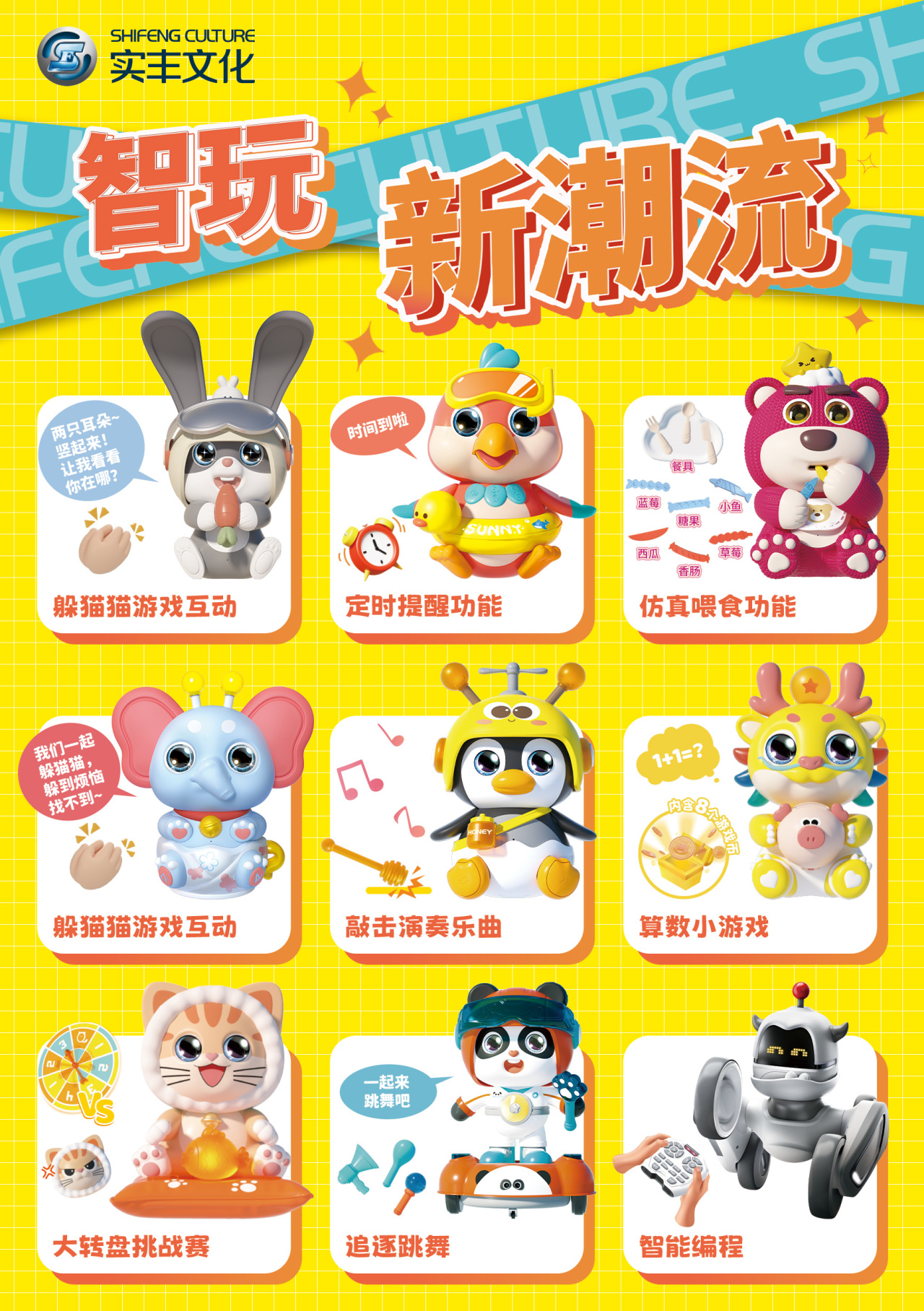 實(shí)豐文化作為國(guó)內(nèi)外知名的玩具制造商,擁有32年的行業(yè)經(jīng)驗(yàn),公司已形成“智能電動(dòng)玩具、IP動(dòng)漫衍生品玩具、潮流玩具”三大主要產(chǎn)品線。公司智能玩具系列融合了多種先進(jìn)的科技元素,如GPT大模型、編程、震動(dòng)感應(yīng)等新技術(shù),打造了智能飛飛兔、企鵝嗡嗡、智能小怪獸、炫舞星際熊貓、摸魚懶懶貓等多款熱銷智能玩具。